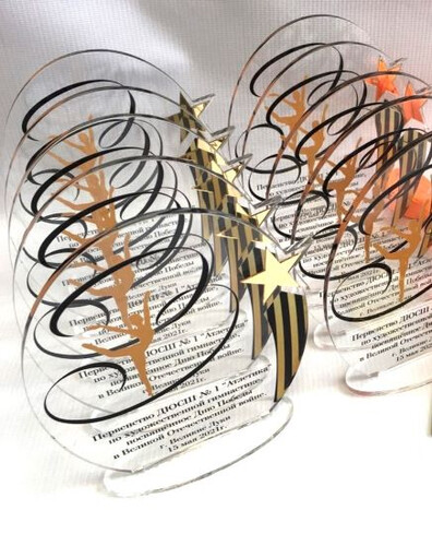Изготовление наград, статуэток и подарков из акрила на заказ — индивидуальный дизайн, УФ-печать и собственное производство.